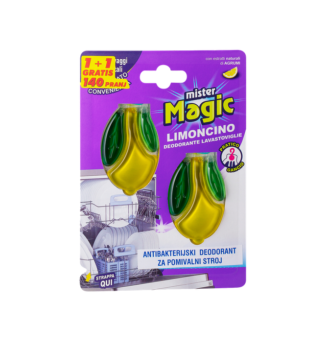Ali želite odpraviti neprijetne vonjave pomivalnega stroja? Mister Magic Limoncino je edinstvena pomoč pri odpravljanju neprijetnih vonjav. Odstranjevanje neprijetnega vonja iz pomivalnega stroja še nikoli ni bilo lažje in hitreje. Zahvaljujoč novi formuli 3 v 1 učinkovito odišavi vaš pomivalni stroj tako, da nevtralizira neprijetne vonjave. Vsebuje naravno antibakterijsko in dišavo, tudi ko ni v uporabi. Praktično: paket Mister Magic Limonette vsebuje 2 osvežilca zraka, ki vam zagotavljata 140 pranj.