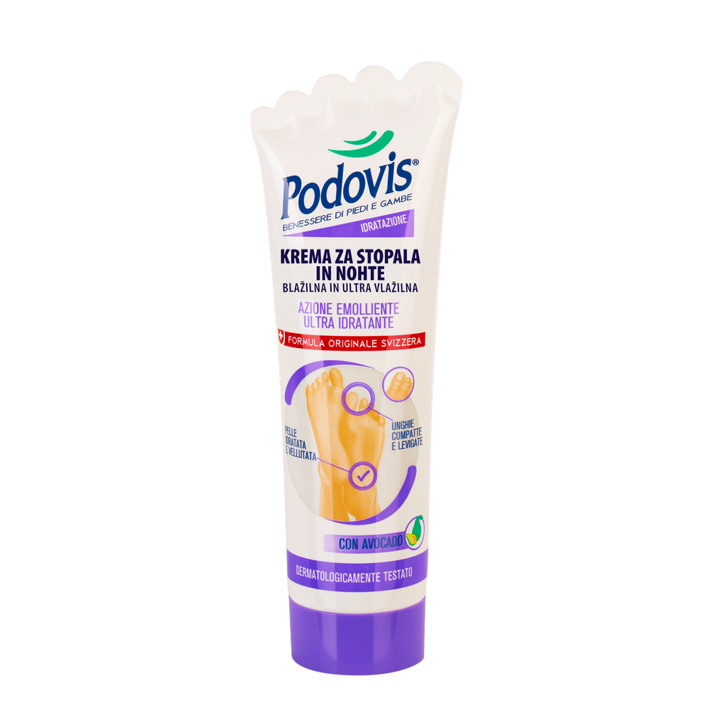 Podovis krema za noge in nohte je posebej zasnovana za nego trde kože stopal. Formulacija z avokadom, ki ohranja elastičnost in derivatov sojinih in koruznih fitoproteinov, ki ohranjajo naravno raven vlaženja. Krema mehča obnohtno kožico in obris nohtov ter jih naredi gladke in gladke. Keratin naredi nohte bolj kompaktne in izboljša njihov estetski videz. Koža je po uporabi navlažena in žametna mehka. Dermatološko testirano.