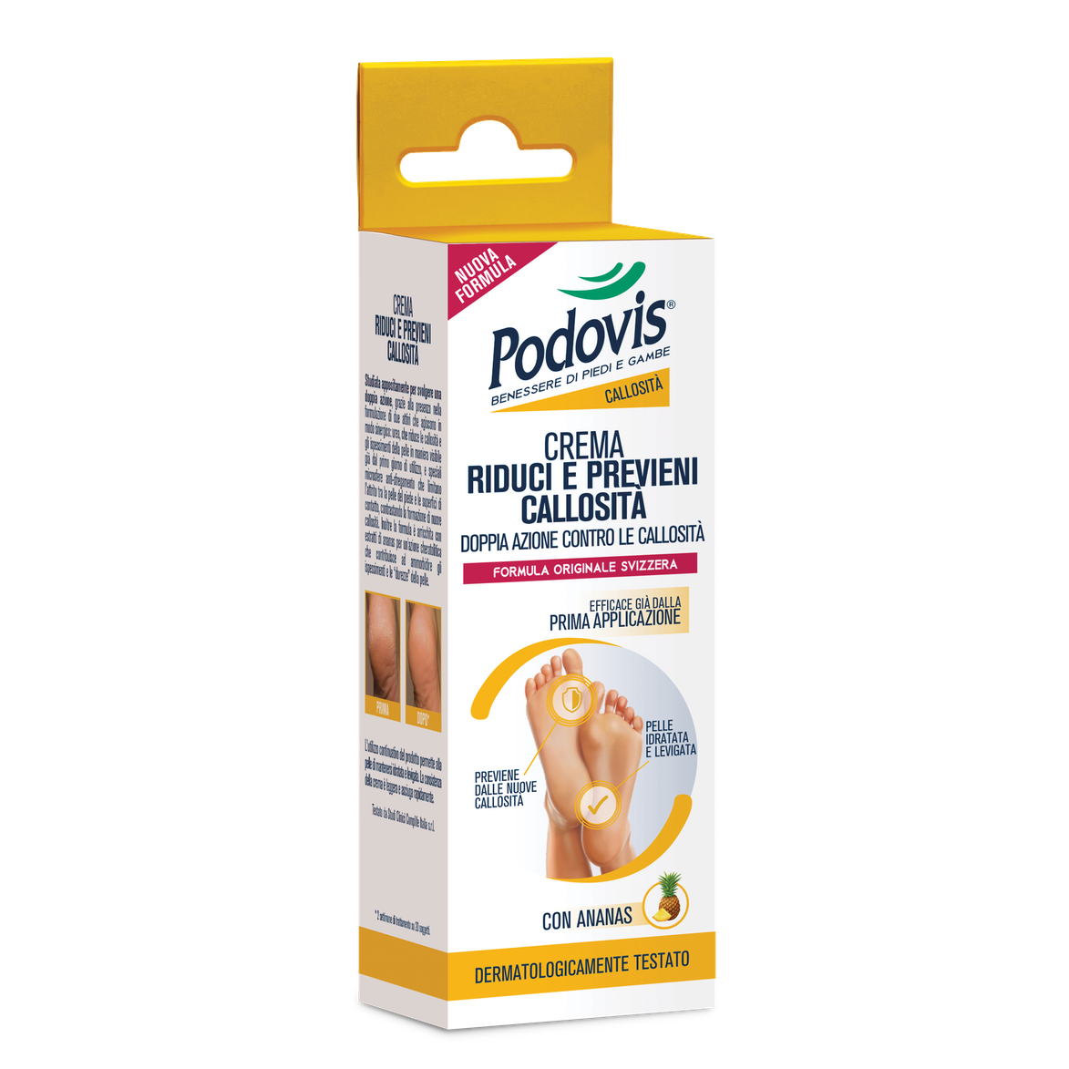 Podovis krema za stopala z učinkom preprečevanja zadebelitve kože in nastanka bradavic. Deluje korektivno in preventivno. Obogatena je z ureo (sečnino), ki preprečuje nastanek bradavic in zadebelitev kože. Formula z izvlečkom ananasa deluje keratolitično in pomaga ublažiti zadebelitev kože. Dermatološko testirano.