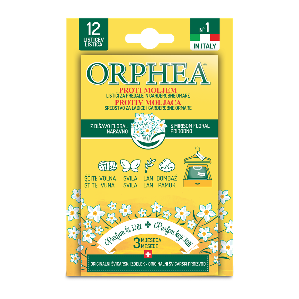 Orphea obešanke proti moljem Floral – Cvet predstavljajo učinkovito zaščito pred molji. Enostavne in praktične so za uporabo – preprosto jih namestite v omare. Izdelani so iz naravnih učinkovin po patentirani recepturi. Naravna aktivna snov geraniol nežno varuje vaša dragocena oblačila (volno, svilo, kašmir, svilo in bombaž) pred molji do 12 tednov.
