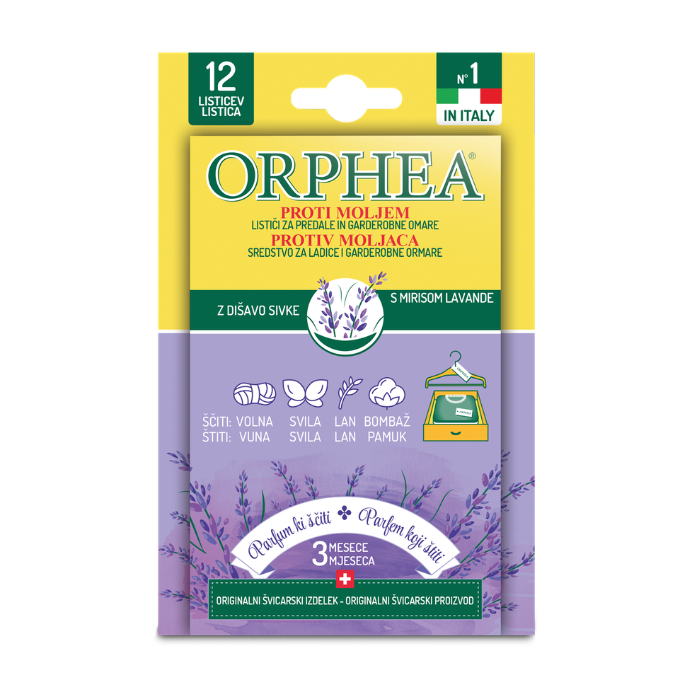 Orphea Lističi proti moljem z vonjem sivke predstavljajo učinkovito zaščito pred molji. Enostavni in praktični so za uporabo – preprosto jih namestite v predale in omare (po en listič v predal ali dva v omaro). Izdelani so iz naravnih učinkovin po patentirani recepturi. Naravna aktivna snov geraniol nežno varuje vaša dragocena oblačila (volno, svilo, kašmir, svilo in bombaž) pred molji do 12 tednov.