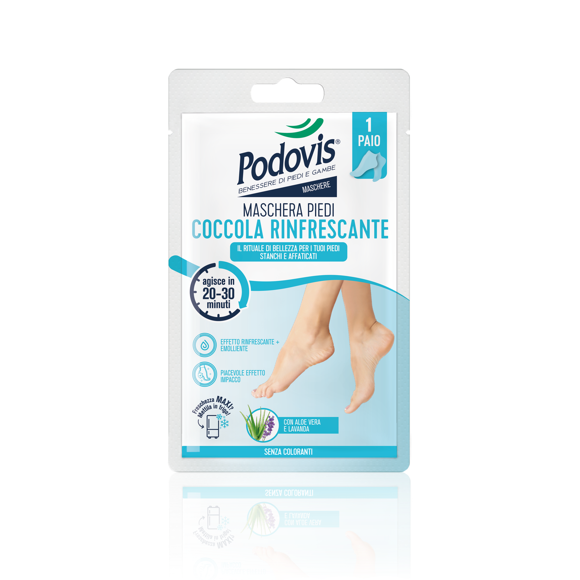 Agresivni geli za prhanje, pogosto umivanje z vročo vodo ali drgnjenje kože zaradi tesne obutve so le nekateri od možnih vzrokov za napeto, suho in zadebeljeno kožo na stopalih. Da bi preprečili nastajanje razpok in dosegli gladko in mehko kožo, je pomembno, da kožo stopal primerno negujete in dovolj navlažite. Podovis® osvežilna maska za stopala v obliki nogavic Coccola Rinfrescante učinkovito pomaga pri preprečevanju zadebeljenosti. Maska neguje kožo, formula z naravnim izvlečkom aloe vere in sivke pa zagotovi novo mehkobo. Brez barvil, dermatološko testirano.