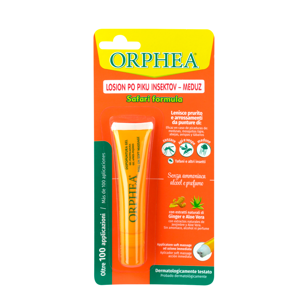 Gel po piku Safari Formula za osebno zaščito Orphea® takoj ublaži pike komarjev, tigrastih komarjev, čebel, os in drugih žuželk. Učinkovit je tudi proti ožigu meduze in proti ožigalkam na splošno. Učinkovine z učinkom zoženja, v kombinaciji z naravnimi izvlečki ingverja in aloe, ki so vsebovani v pripravku, delujejo blažilno in lajšajo srbenje ter morebitne rdečice. Formula ne vsebuje amoniaka, alkohola in dišave in je zato še posebej nežna. Izdelek je dermatološko preverjen. Inovativni aplikator Soft Massage omogoča, da natančno umerite izstop izdelka in njegov nanos na zadevno območje kože.